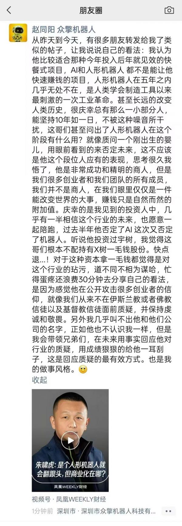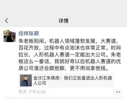 上述观点公开后,经纬张颖在朋友圈发文称:机器人领域蓬勃发展,大赛道百花齐放,过程中有点泡沫也非常正常。时间拉长,人形机器人赛道一定能出大公司。朱老板这么一番话,我就好奇以后机器人赛道的优质公司谁还会跟他聊,更不用说拿他钱。