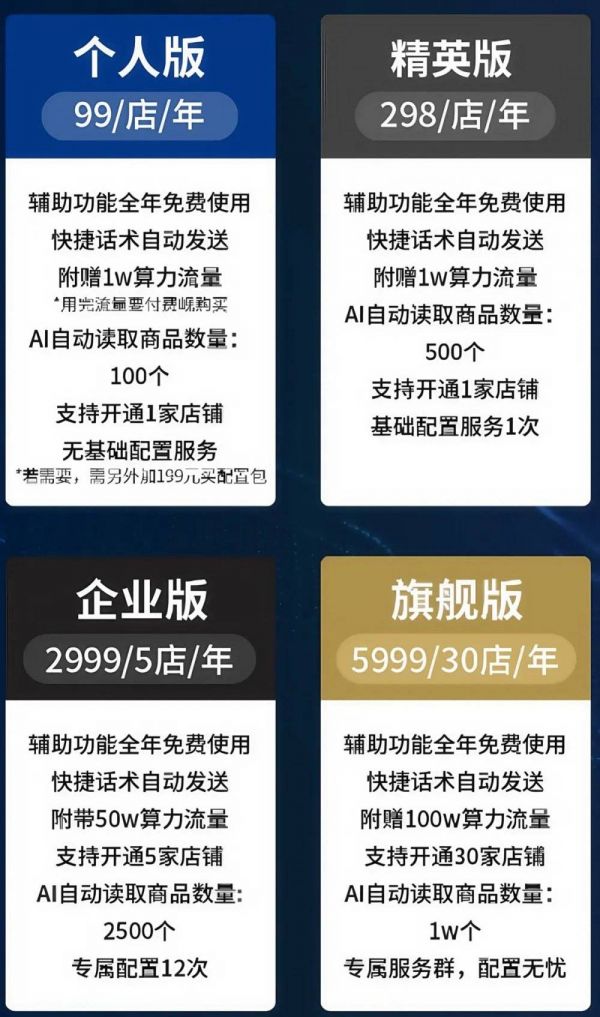 最基础的“个人版”售价99元/年,只支持单店使用,而且需要买家自行通过视频教程和操作手册配置AI客服的回应话术。销售人员更推荐记者购买“精英版”,“精英版的话我们是有拉群,有技术人员在群里随时解答”。如果想在多个平台开通AI客服,就要买更贵的“企业版”或者“旗舰版”。