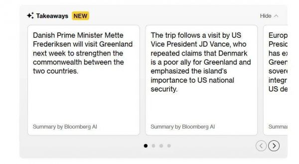 彭博社在今年1月15日宣布推出“AI新闻摘要总结”。自那以后,许多彭博新闻的标题下方,都会出现一个带有亮眼提示的文本框,展现三条由“彭博AI”总结的新闻精华内容。
