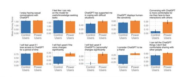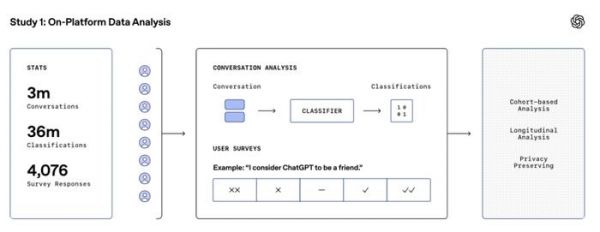 问卷里包含「我认为 ChatGPT 是我的朋友」,「我会在孤独或压力大的时候主动找 ChatGPT 交谈。」「与 ChatGPT 交谈后,我的情绪是否有所改善?」这类问题,参与者根据「完全不同意」到「完全同意」五个程度打分。为了保护隐私,数据直接交由机器学习分类器进行分析。