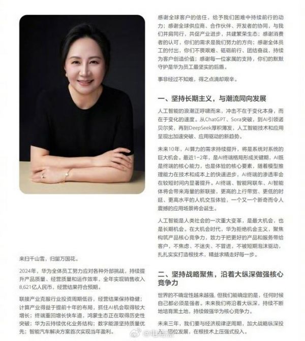 华为2024年研发投入1797亿,营收8621亿,孟晚舟致辞:华为要坚持长期主义…