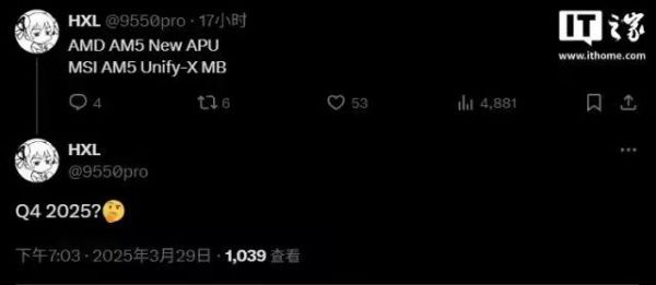 根据爆料人 HXL 提供的信息,AMD AM5 平台的新 APU 有望在 2025 年第四季度发布。