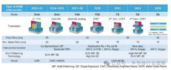 在IEDM上,台积电研究人员报告称,他们使用CFET构建了“第一个功能齐全的3D单片CFET反相器,其接触间距为业界领先的48 nm。”研究人员堆叠了n-FET-on-p-FET纳米片晶体管,并带有背面接触和互连,以提高性能和增加设计灵活性,S.Liao说。图3显示了2035年的路线图和CFET的引入。