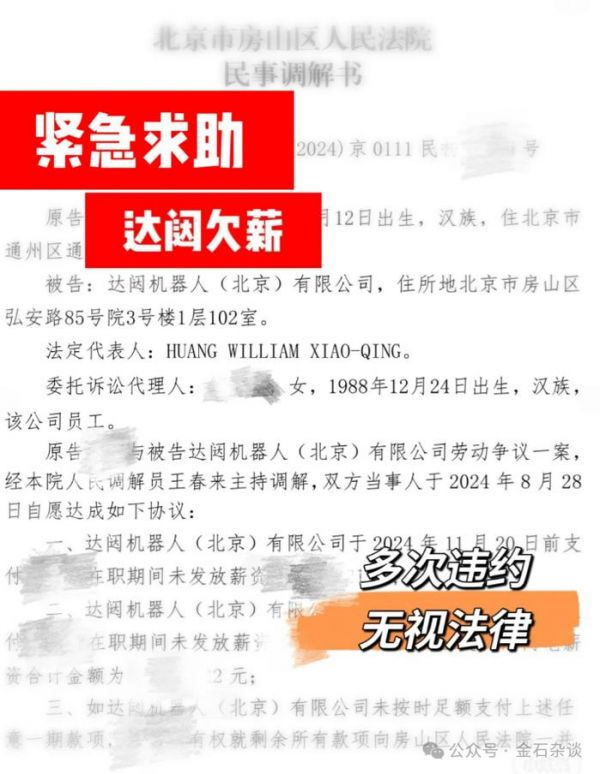 此外,该网友还晒出达阀机器人薪资一步步停止发放的过程:2024年1月降薪30%,打感情牌,安抚员工;3月发薪日无限延期,各种承诺;5月老板激情画大饼,号召共渡难关;6月摊牌,协议承诺发放欠薪和及经济补偿金;8月老板娘哭诉表决心,签订调解书;最终员工们发现,法院胜诉了但公司账上零资产。