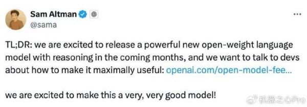 今天凌晨,奥特曼发推宣布,OpenAI 将在未来几个月发布一款具备推理能力的强大新型开放权重模型。