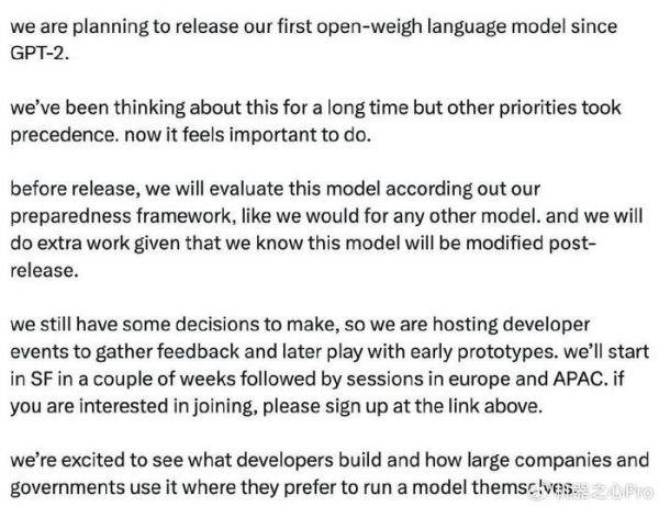 奥特曼进一步称,OpenAI 正计划发布自 GPT-2 以来的第一个开放权重语言模型。OpenAI 已经考虑了很长时间,但其他优先事项耽误了进程。现在觉得做这件事很重要。