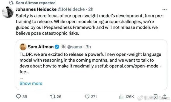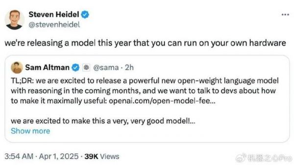 另外,OpenAI 研究者 Steven Heidel 表示,这个开放权重模型将可以在用户自己的硬件上运行。