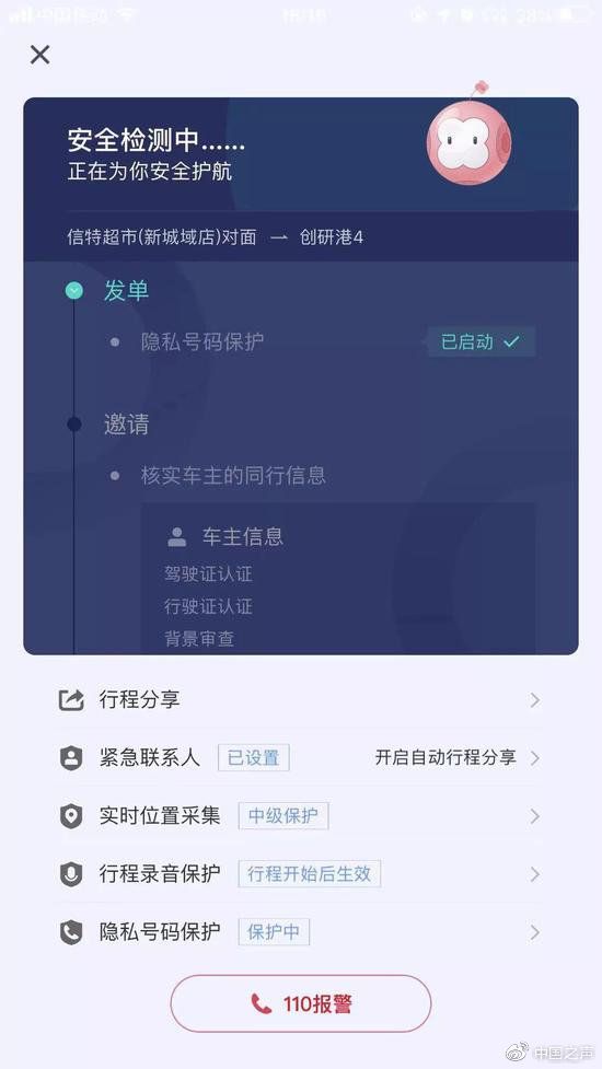 “现在注册之前还要做一个简单的一个知识培训,然后有一个乘客指南。我觉得最不一样的地方就是增加了一个‘安全一键全知道’功能,里面还提供紧急联系人,还有自动一键报警,行程分享等,这都是原来顺风车不具备的。”