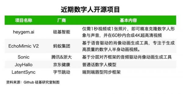 比如硅基智能在近期开源数字人模型 heygem.ai,阿里达摩院推出的 EchoMimic V2,专注在数字人半身动画视频生成;腾讯与浙大联合开源的 Sonic ,京东开源的普通话数字人项目JoyHallo、字节跳动推出的端到端唇形同步框架Latentsync等等,都在加速数字人技术的普及。