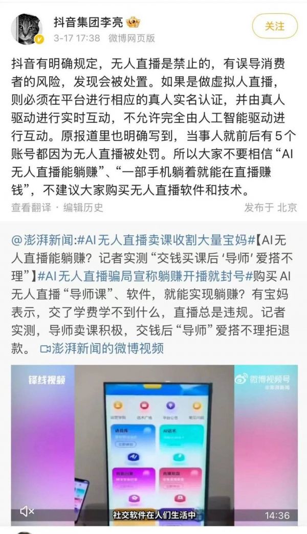 抖音明确禁止无人直播 图源:微博