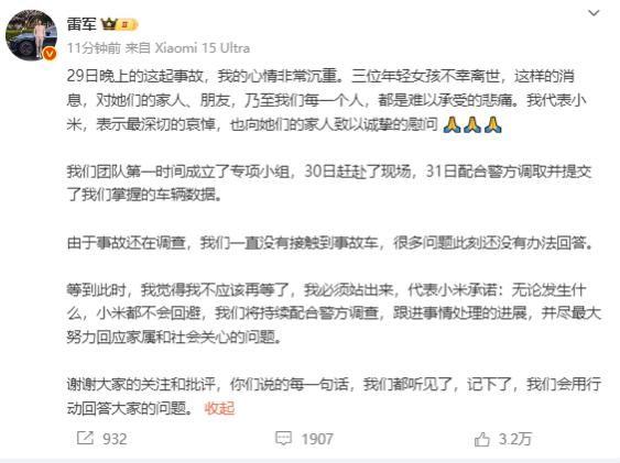在“小米SU7高速车祸致3死”事件持续发酵下,4月1日22时20分,小米公司创始人、董事长兼CEO雷军微博发布最新动态。他表态“无论发生什么,小米都不会回避”。 与其往日保持高频更新的节奏不同,此次距离其上一条微博动态,已超24小时 。