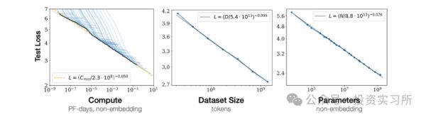 该论文提出,语言模型的性能会随着计算能力、数据集规模和参数的增加而平稳提升。 从图表来看,X 轴是对数刻度,这可能意味着数据的边际收益递减。换句话说,这条曲线可能呈现出“logistic curve”(S 型曲线)的形态——即当数据量达到一定程度后,收益会趋于平稳。但这并不影响整体趋势,因为随着问题的复杂度增加,新的 S 型增长仍然可能出现,也就是说,可以不断“叠加曲线”。