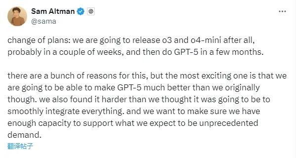 奥尔特曼当天在社交媒体上发文称,GPT-5的发布比预期要晚,但这是有原因的,最令人兴奋的是,现在有能力把GPT-5做得比最初预期的要好不少。