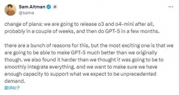 奥尔特曼当天在社交媒体上发文称,GPT-5的发布比预期要晚,但这是有原因的,最令人兴奋的是,现在有能力把GPT-5做得比最初预期的要好不少。