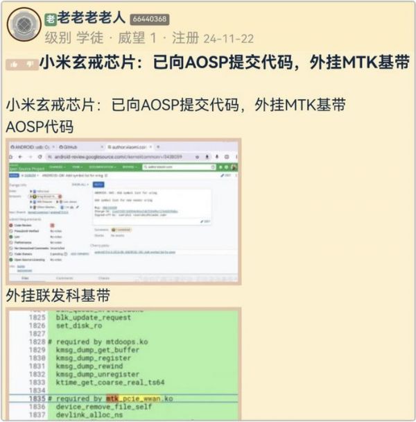 一月份微博自媒体“定焦数码”就曾爆出粉丝群有用户讨论小米自研芯片「玄戒」已经向 AOSP 提交相关代码,将采用外挂联发科基带。