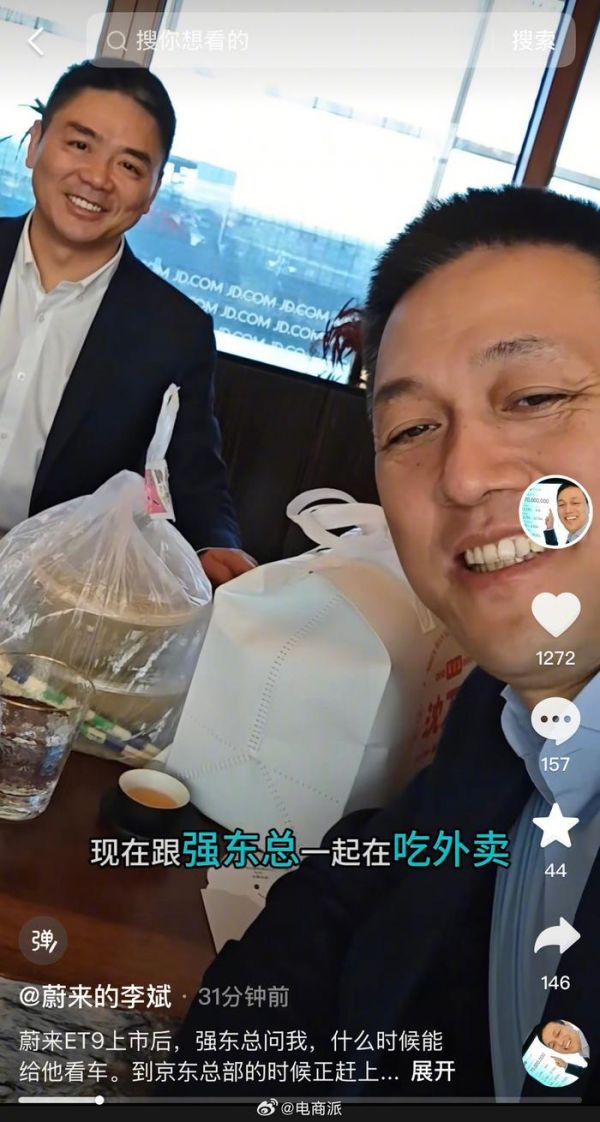 蔚来李斌与刘强东开心合影,大佬们还一起吃京东外卖。
