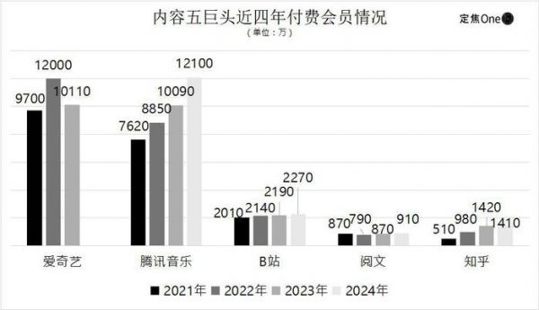 付费会员数量上:腾讯音乐(1.21 亿)/ 爱奇艺(未披露)>B 站(2270 万)> 知乎(1410 万)> 阅文(910 万)