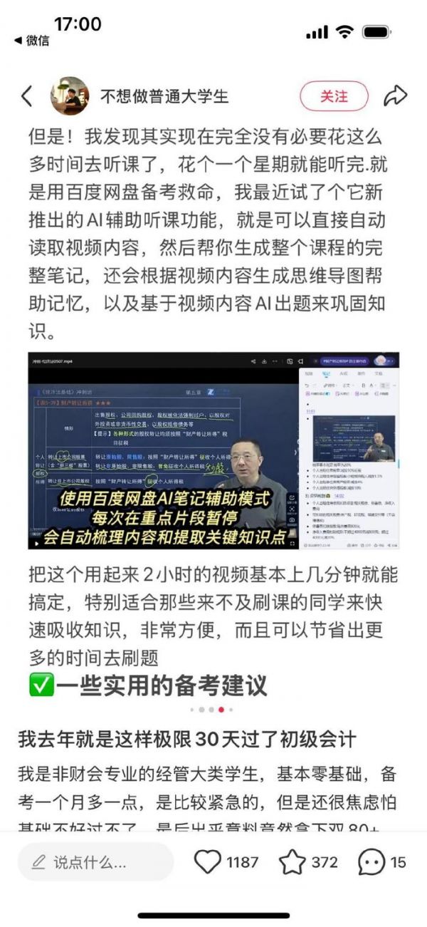 有意思的是,虽然官方没有大张旗鼓的宣传,但这个小笔记在多个社交平台掀起热潮,小红书一位备考注会计师的用户发帖称:“考前三天才发现这个宝藏,4小时网课的笔记1分钟生成,重点难点一目了然,简直是救命稻草!”