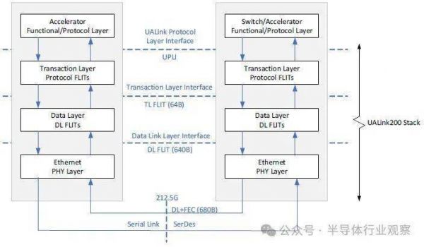 具体而言,从外到内,UALink堆栈从稍微修改过的以太网SerDes开始,其信号速率为215.5 GT/秒,一旦考虑到编码开销,每个UALink通道的带宽就会减少到200 Gb/秒: