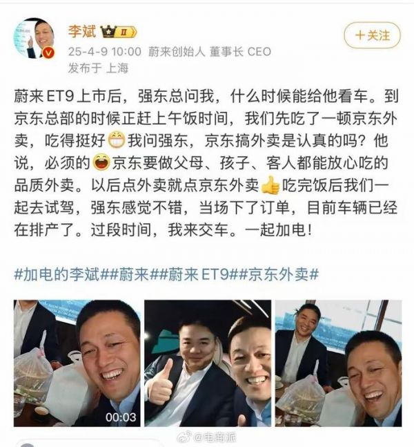蔚来李斌与刘强东开心合影,大佬们还一起吃京东外卖