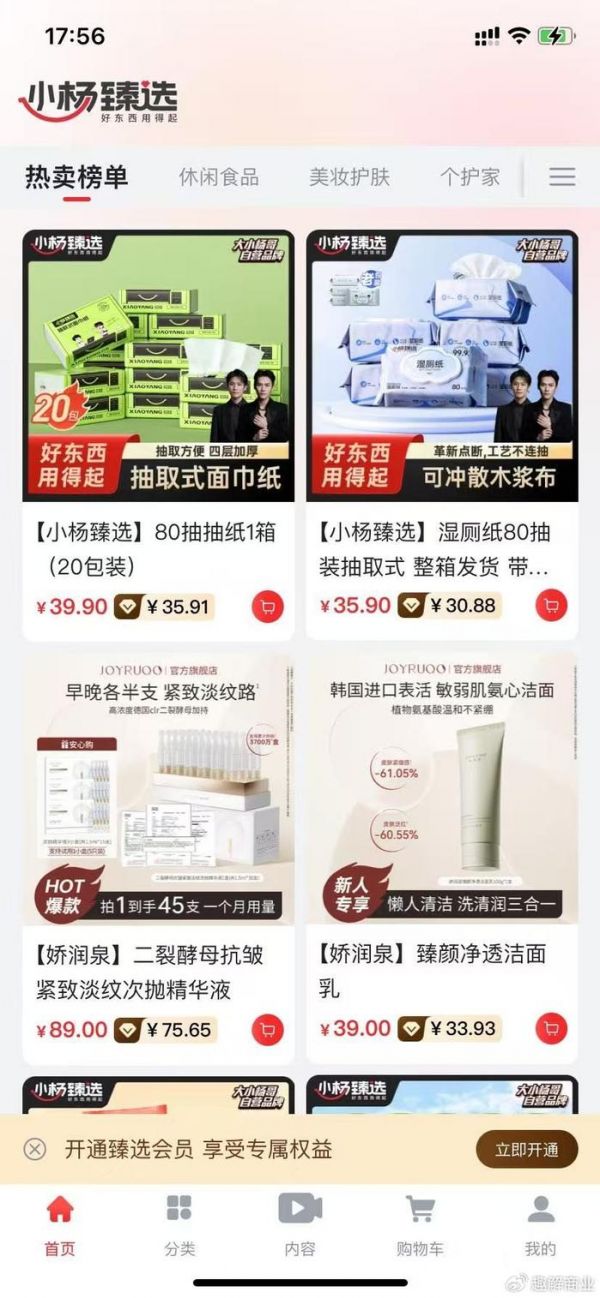 “趣解商业”注意到,小杨臻选APP为会员制,会员年费99元,承诺省不够随时退。目前,商城分为休闲食品、美妆护肤、个护家清、日用百货、饮料乳品、服饰箱包五大板块。不过,目前,商城内的商品并不多,销量也不高。其中,销量最高的是一款售价9.9元的垃圾袋,已售30+。