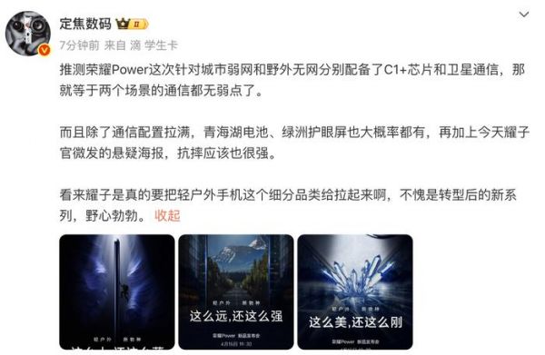 官方先后发布的“这么大,还这么薄”、“这么远,还这么强”卖点悬念海报,暗示荣耀Power在续航和通信上可能会有大突破。荣耀Power可能将实现行业从未有过电池容量,超越当前市面上7800mAh的电池容量,以满足户外出行的续航需求。通信上,新系列或许具备卫星通信能力,将通过强劲通信技术优化,实现“城市角落不断联、户外也不失联”。