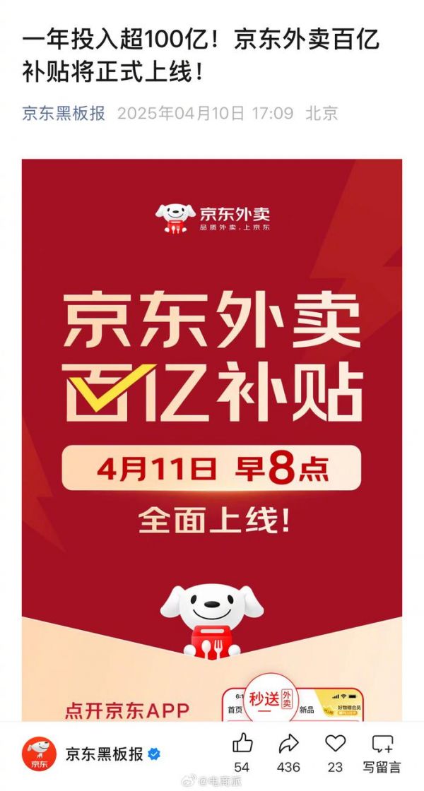 一年投入超100亿,京东外卖也整上百亿补贴了。