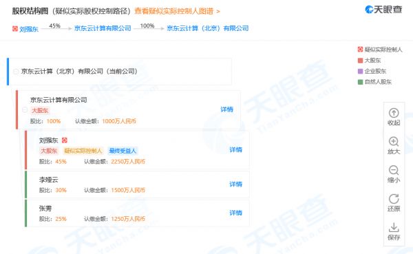 京东云计算(北京)有限公司成立于2019年2月,注册资本为1000万人民币,经营范围包含数据处理、技术开发、计算机系统服务等。刘强东为该公司的疑似实际控制人,和最终受益人之一,该公司为京东云计算有限公司的全资子公司,刘强东持有后者45%的股份。
