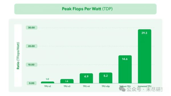 为了避免被美国电力瓶颈“卡了脖子”,Ironwood的能效(峰值算力FTlops/热设计功率TDP)继续大幅提升,是TPU v6的2倍,比2018年的TPU v2高了近30倍。