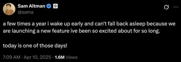 “今天就是这样的日子!”Sam Altman当地时间4月10日一大早又在X上称。