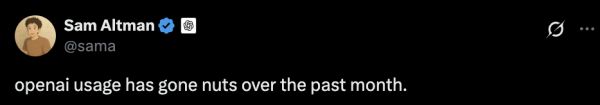 Sam Altman称OpenAI用量疯长|图片来源:X
