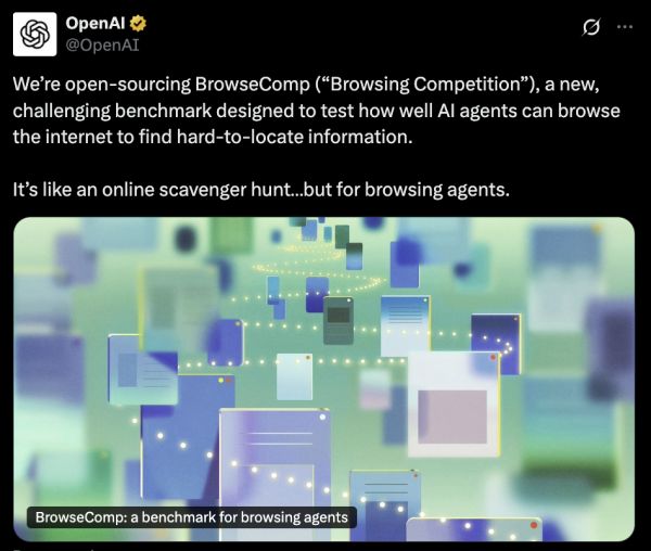 OpenAI称“可以把它看作是一场在线寻宝游戏……但对象是浏览型AI agent。”