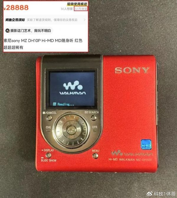 它叫做索尼Hi-MD随身听,型号是MZ-DH10P,应该是2004年发布的产品。关键这货一般都是银色,但闲鱼这台是罕见的大红色,卖家说比黄金或纯银定做的Qualia 017还稀有,因此报价28888元还不议价,瞬间吸引了3.1万人浏览。