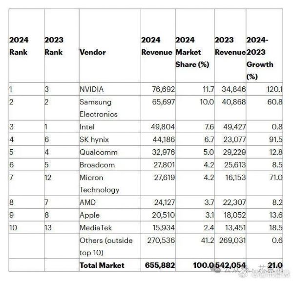 具体来说,英伟达2024年半导体营收达766.92亿美元,同比暴涨120.1%,排名自2023年的第三名跃至2024年的第一名,主要受益于图形处理器(GPU)需求显著增长;三星2024年营收656.97亿美元,同比大涨60.8%,维持第二名,这主要得益于存储芯片出货量和价格上涨;英特尔2024年营收为498.04亿美元,因面临的竞争加剧,同比增长仅0.8%,自2023年的第一名跌落至2024年的第三名。