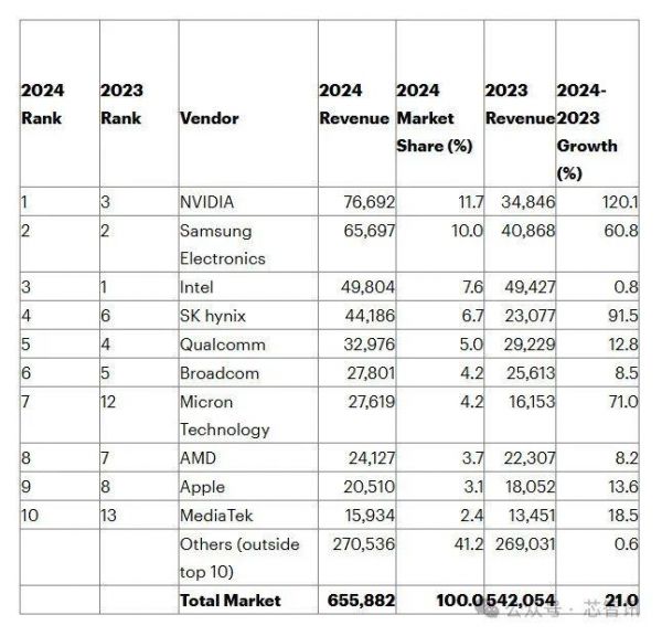 2024年全球半导体营收达6559亿美元,同比增长21%!英伟达升至第一!