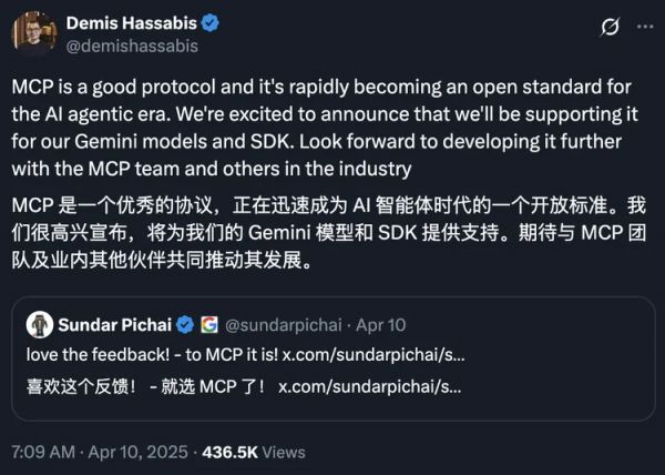 AI领域的互操作性标准之争正变得异常热闹。就在本周,Google DeepMind CEO Demis Hassabis宣布,将为其Gemini模型添加对Anthropic主导的模型上下文协议MCP的支持,称其为“一个优秀的协议,正迅速成为AI Agent时代的开放标准”。这距离OpenAI CEO Sam Altman宣布支持MCP仅仅过去几周时间。