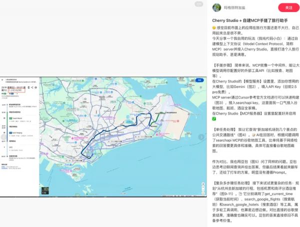 另一个更生动的一个例子来自一位自称代码小白的开发者“玛格丽特加盐”,他利用Cherry Studio平台,接入Gemini模型,并参考官方文档自建了一个MCP服务器,该服务器集成了搜索API(包含谷歌地图、航班、酒店工具)。通过这种方式打造了一个个性化的旅行助手。