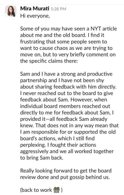 去年3月,《纽约时报》曾援引知情人士称,实际上,穆拉蒂曾向奥特曼发邮件,质疑其管理能力,并向董事会表达了她的担忧,这直接促成了董事会的罢免行动。