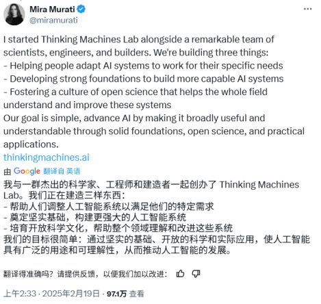 最终,在今年2月,穆拉蒂终于揭晓她的新公司名叫Thinking Machines Labs,宗旨是开发以人机协作为中心的下一代AI系统,而非追求完全自主的超强AI。
