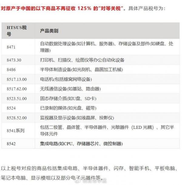 特朗普突然宣布豁免部分中国电子产品、电子元器件125%关税!是什么原因?4月11日晚间,美国海关发布公告,根据特朗普总统当日签署的备忘录,对以下税号的商品不征收第14257号行政令(即4月2日发布的“对等关税"行政令,以及于4月8日和4月9日发布的修订行政令)下的“对等关税”。
