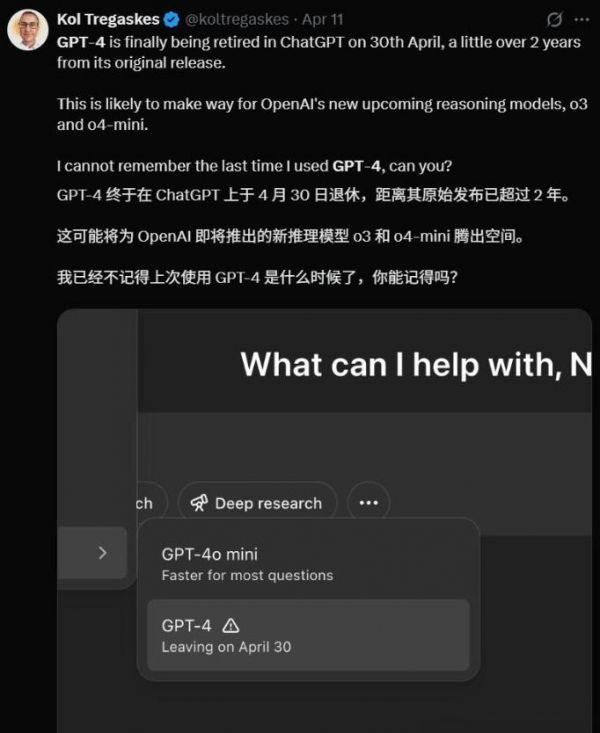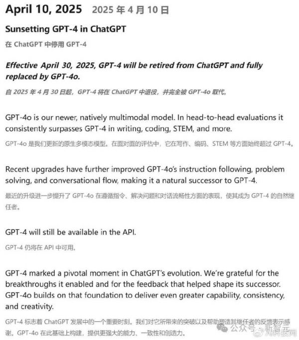 今日(2025年4月13日),人工智能领域迎来历史性时刻——OpenAI正式宣布,其标志性模型GPT-4将于4月30日从ChatGPT服务中退役,全面由新一代模型GPT-4o接替。这一决定标志着自2023年3月GPT-4发布以来,全球生成式AI技术首次进入大规模迭代周期,也预示着更强大的多模态智能时代正式启幕。
