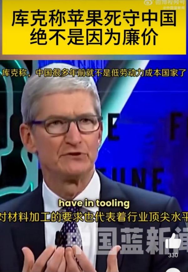 今天看到苹果CEO库克的说法:他认为,苹果来中国是为了低成本劳动力,这个说法早就过时了。 中国是系统化、规模化、产业化的存在, 而且有足够多、足够专业、协同高效的产业工人。