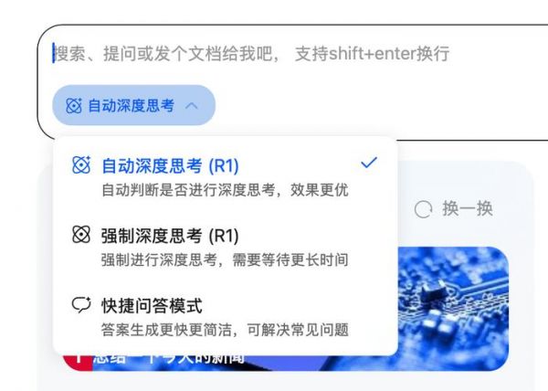说回对话界面,小艺助手网页版明显提供了更丰富的交互引导,更接近豆包的做法。同时,尽管和小布助手网页版一样默认「自动深度思考(R1)」,但小艺助手网页版比较好的一点是提供了「强制深度思考(R1)」的选择,方便用户按需选择: