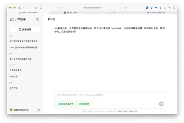 这几天,有网友就发现 OPPO 悄悄上线了小布助手网页版(https://xiaobu.coloros.com)。雷科技测试发现,小布助手网页版可以用 OPPO 账号直接登录,整体设计则与 ChatGPT、阿里通义非常相近,侧边是对话列表,主体是AI对话界面,支持基于 DeepSeek-R1 的智能深度思考。