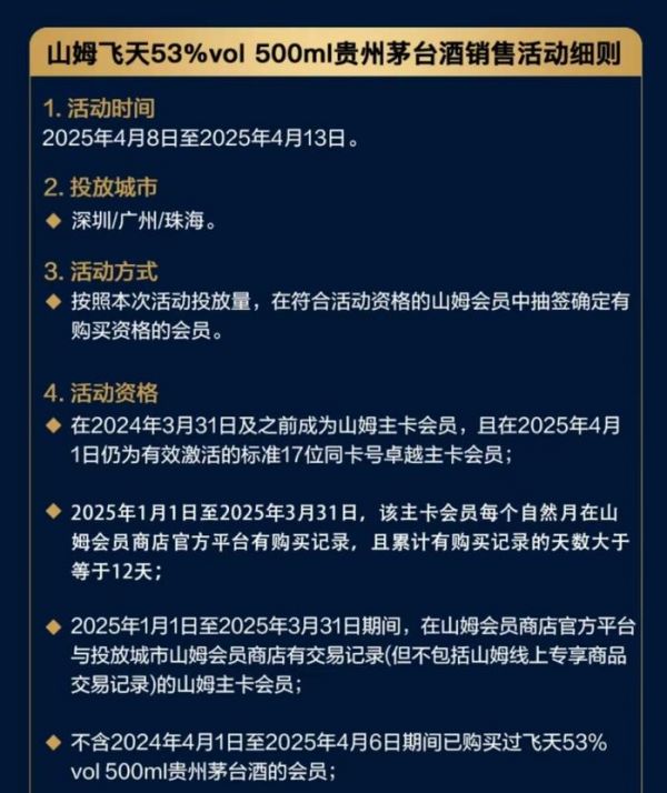 根据山姆4月的飞天茅台酒销售活动细则,需要满足会员卡等级、消费频次等多个维度才能获得参与活动资格。具体包括在2024年3月31日及之前成为山姆主卡会员,且在2025年4月1日仍为有效激活的标准17位同卡号卓越主卡会员;2025年1月1日至2025年3月31日,该主卡会员每个自然月在山姆会员商店官方平台有购买记录,且累计有购买记录的天数大于等于12天等等。