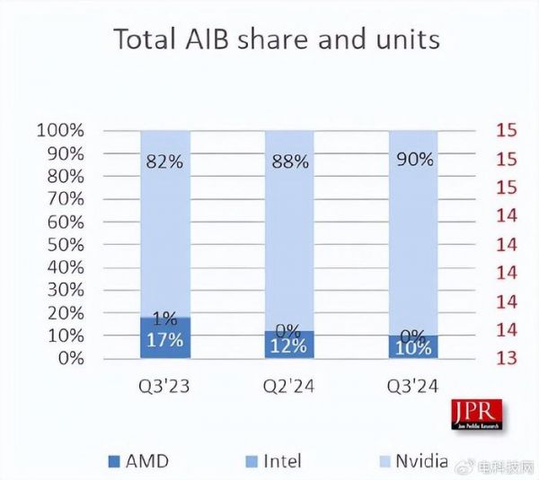 再来看看GPU市场。收购完ARM后,英伟达已成为人工智能处理领域无可争议的领导者,在GPU市场,就更没有英特尔什么事儿了。调查机构Jon Peddie Research一项数据显示,英伟达在2024年第三季度在AIB市场几乎呈现出垄断趋势,市占率达到了可怕的90%。