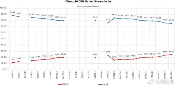 AMD 2024 年在消费级 PC 市场的份额增加了 4%,英特尔虽然仍保持领先地位,在 2024 年第四季度占据 75.4% 的市场份额,但其市占率正呈现出明显的下降趋势,AMD则在稳步追赶。