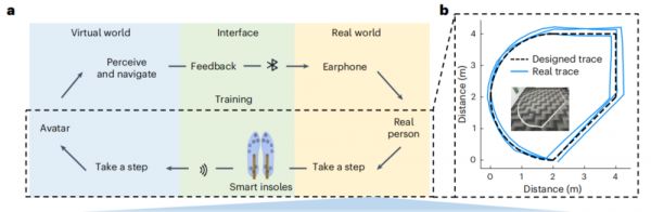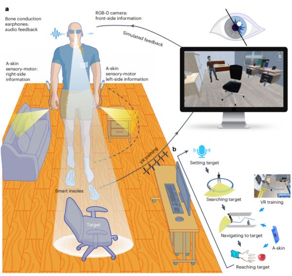 直观的空间提示听觉输出和导航算法,有助于减轻认知负担;A-skin 的独特设计和放置有助于在恶劣环境中完成导航和导航后任务;虚拟现实(VR)训练有助于快速、安全地进行训练;基于摩擦发电的智能鞋垫则能够以最低的功耗实现虚拟世界和现实世界的同步运动。