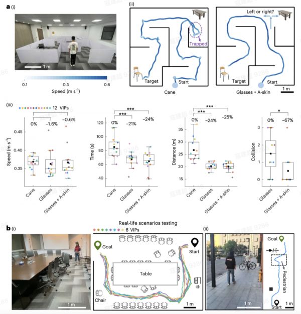 与传统的白手杖相比,该系统转弯更流畅,寻路效率更高。统计分析显示,使用可穿戴系统的步行速度与使用拐杖的速度相当。导航时间和行走距离大幅减少了约 25%。加入电子皮肤后,碰撞事故明显减少。