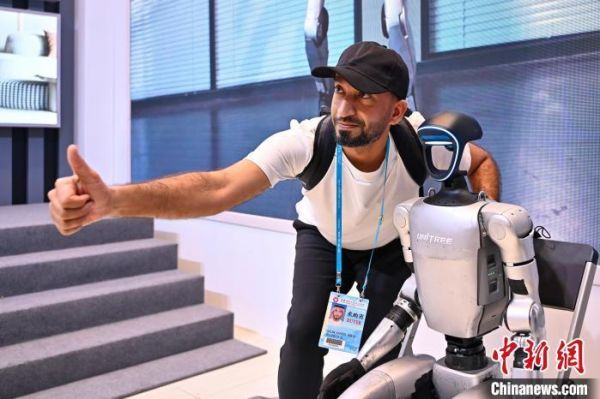 图为采购商与人形机器人合影。 陈骥旻 摄深圳市大象机器人科技有限公司展出的一款智能仿生机器宠物备受欢迎。该公司商务经理林媛绮介绍,目前有许多来自中东、亚洲、欧洲等地的客户前来咨询,部分客户甚至现场下单。